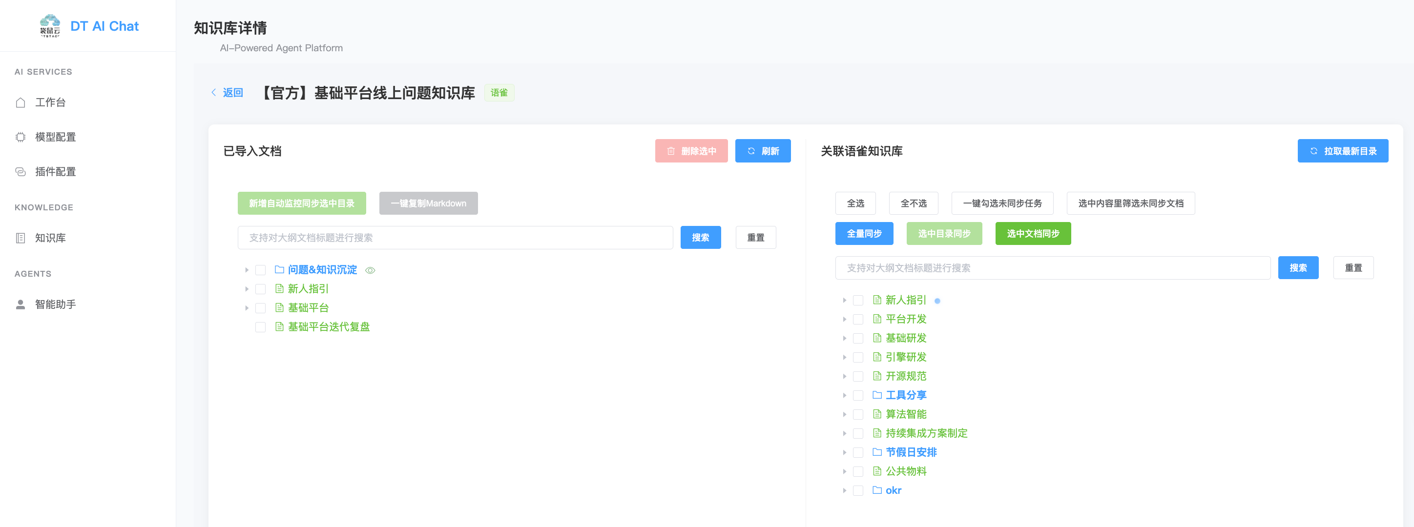 我们将内部语雀文档知识库对接进来将特定目录下的文档导入: