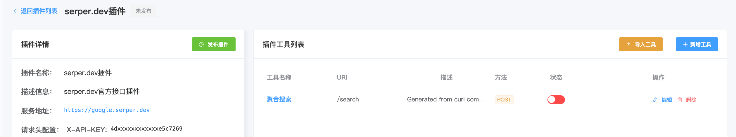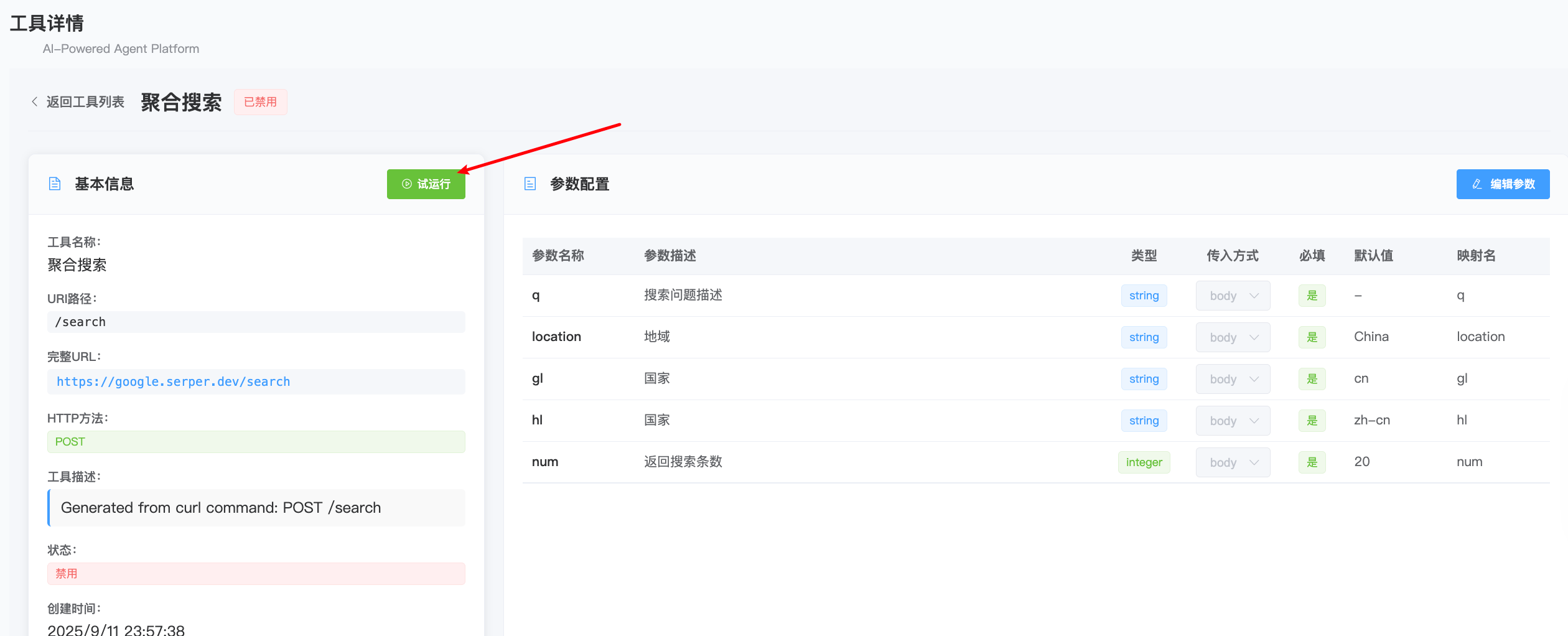 再次点击工具名称,我们进入到具体工具的配置栏目,配置栏目左边就是工具的信息包含对接的http接口的请求方式、参数等等,同时还包含有一组参数配置: