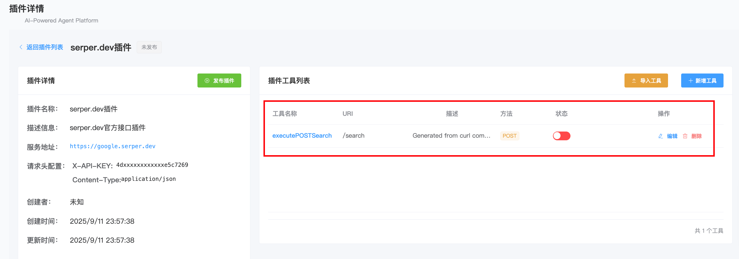 我们回到工具列表,将工具进行启用,同时将插件进行发布,启用与已发布如下所示: