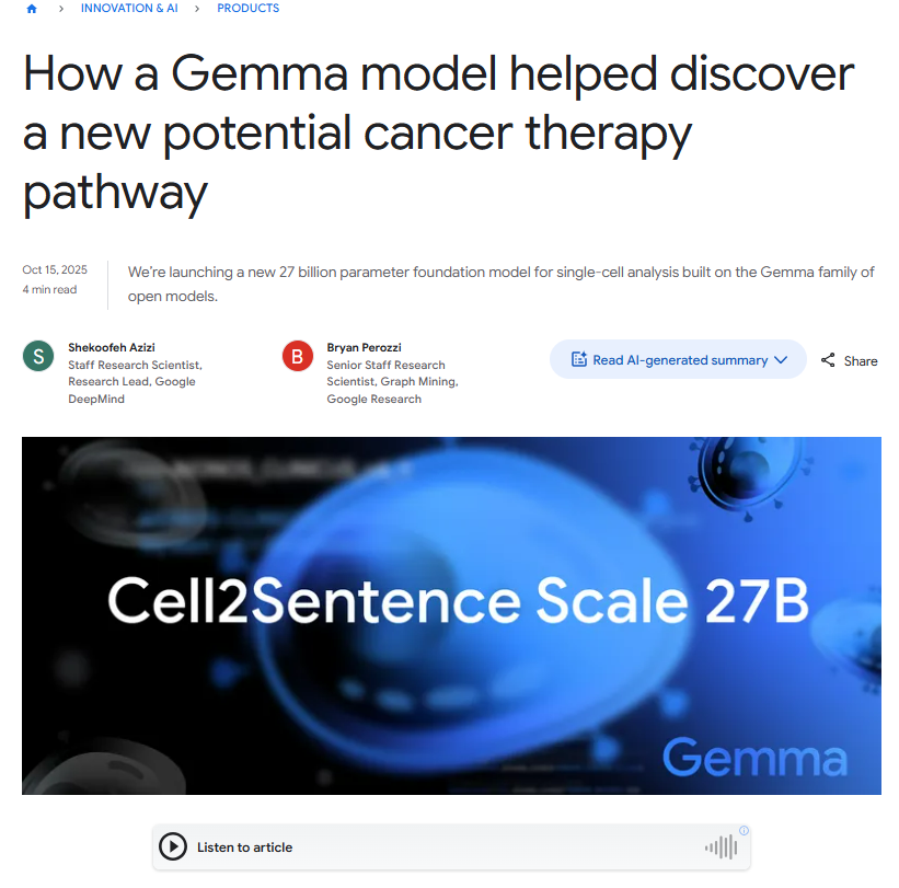 - Google 官方博客(癌症发现):https://blog.google/innovation-and-ai/products/google-gemma-ai-cancer-therapy-discovery/