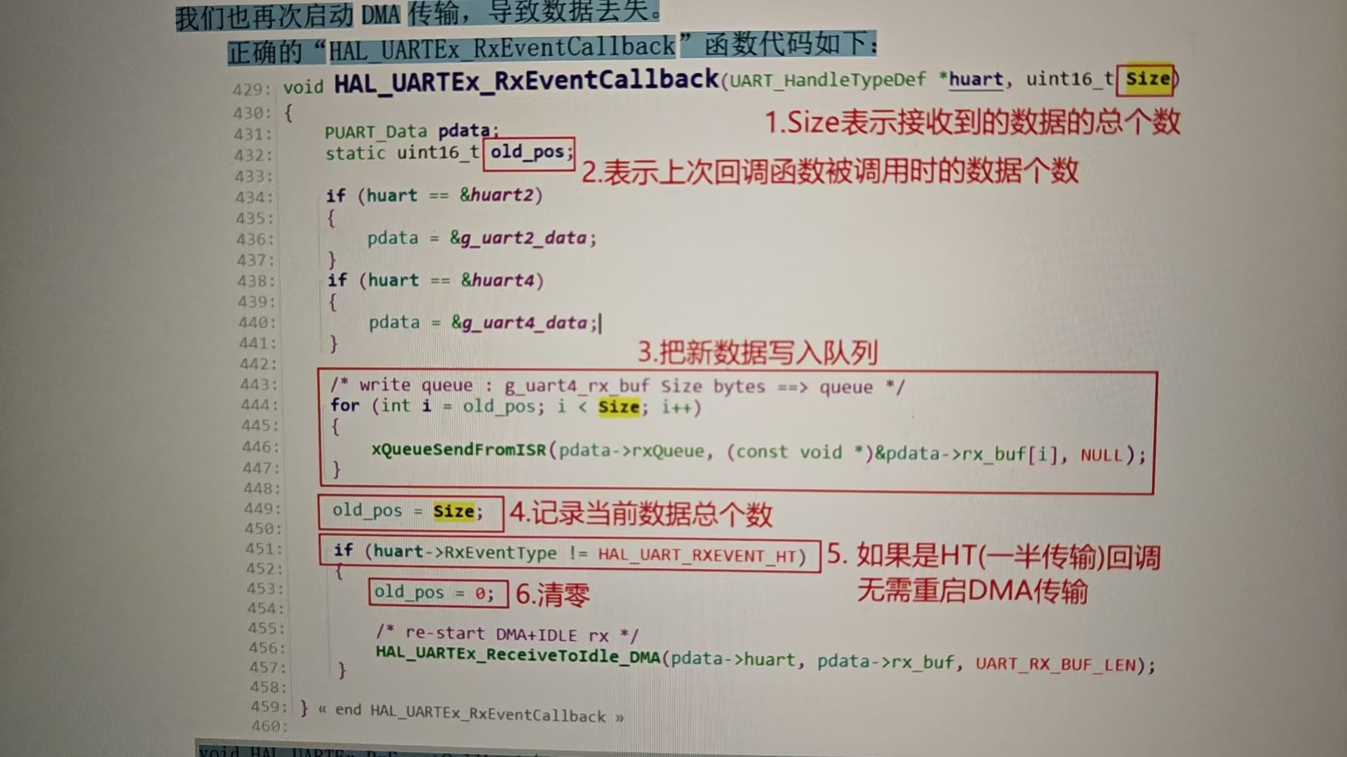 old_pos记录上次已经处理到哪个位置。由于半传输、完成、空闲可能会多次进入回调,我们需要知道哪些数据是新的。 -