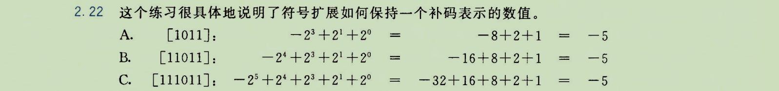 通过对公式(2.3)的直接计算,验证 [1011], [11011], [111011] 均为-5的补码表示(后者是前者的符号扩展)。