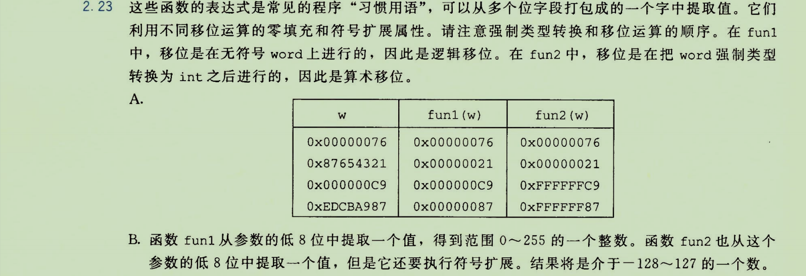 fun2:(int) word 先将无符号数 word 强制转换为 int(保持位模式,重新解释)。<<24 和 >>24 均为有符号运算(算术右移)。此操作实质是提取低8位,并进行符号扩展至32位。