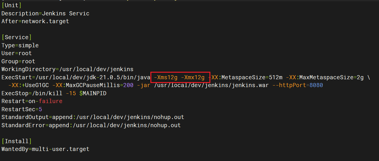 还提升了启动 Jenkins 时的 JVM 参数配置,如下。