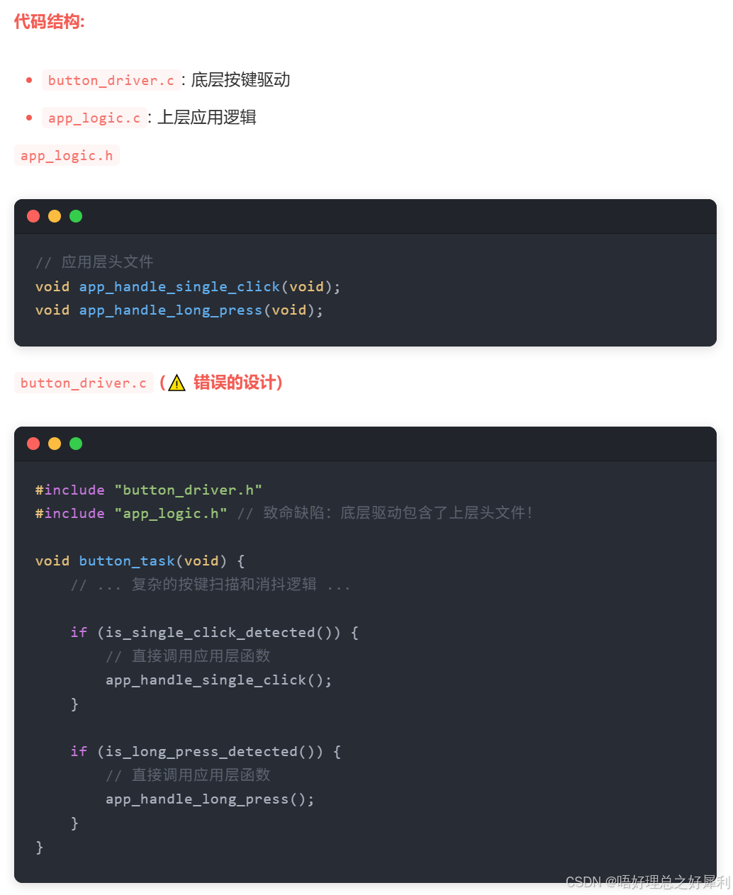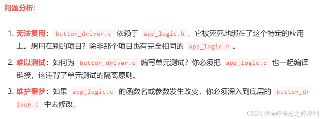 我们在按键驱动 里面,往往同样会写,在按键被按下后,执行相应动作 ,恰恰这个动作又与按键本身无关,这就造成了耦合,即按键驱动里面,有其他的文件的函数,驱动它本应该只关心只与按键有关的事情。(疑问:那能不能在外面读取、获得按键的值后,再执行对应的操作,不一定都要放驱动里面?可能放在驱动里面的好处是,测试代码也可以在驱动文件内完成)