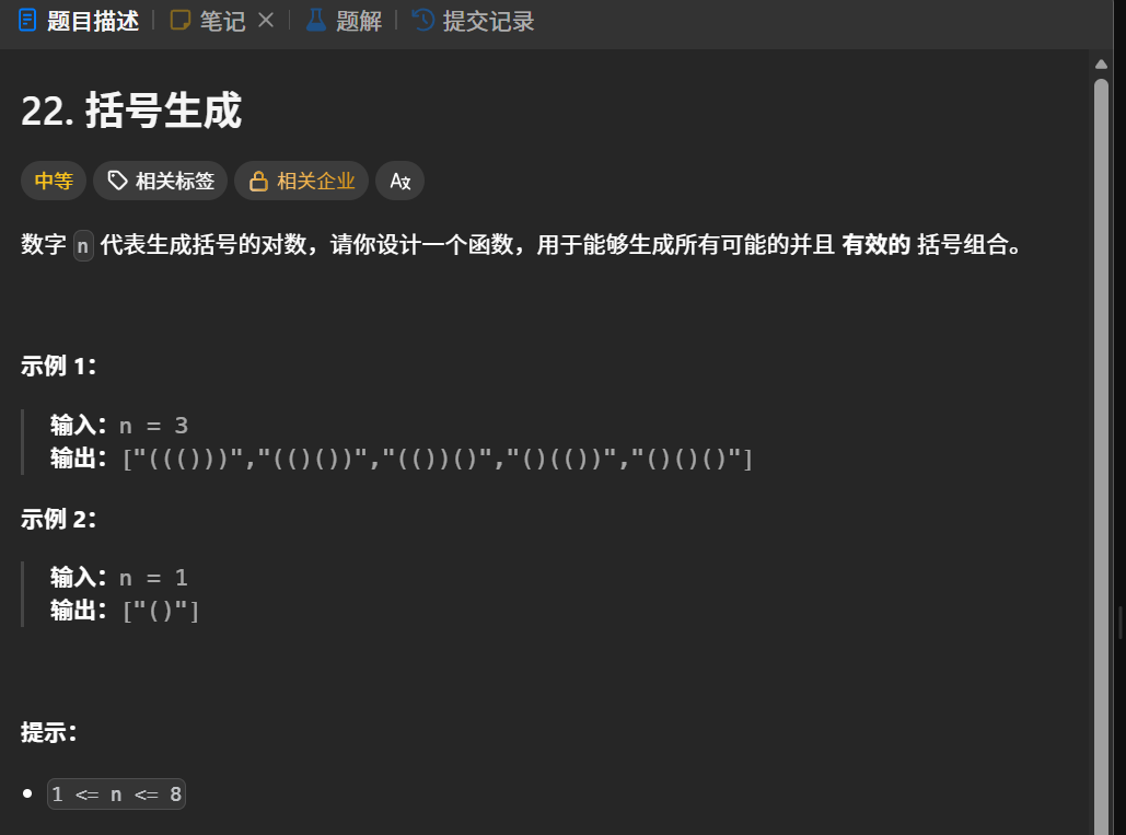 vector<string>& ans 引用类型的字符串数组,存储所有有效括号字符串 string& cur 引用类型的字符串