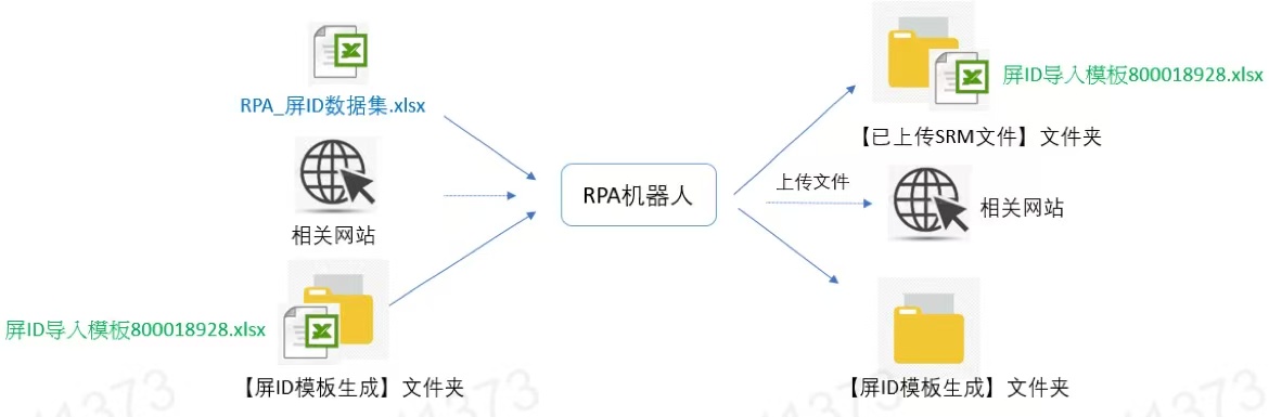 ① 最核心的逻辑主要是使用Python获取 RPA_屏ID数据集.xlsx文件 的总行数data_row_num ,排除表头(起始行设置第2行,起始列设置A列;结束行设置第data_row_num行,结束列设置F列),循环读取该文件的每一行数据,抓取E栏位"送货单号"中的单据号,在指定网页进行检索需要上传文件的行信息,再抓取A栏位"DONO"中的单据号,模糊匹配"屏ID模板生成"文件夹中的对应文件,进行文件上传,后续完成该行RPA操作以后,F栏位"送货状态"将会自动回填"已上传",RPA机器人只会遍历去执行D栏位"状态"为"已完成"且F栏位"送货状态"为空的行数据