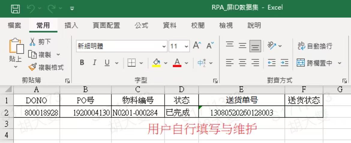 该RPA机器人后期会循环遍历Excel的每一行数据,抓取E栏位"送货单号"中的单据号,在指定网页进行检索并上传已A栏位"DONO"相关的文件,完成上传文件以后,F栏位"送货状态"将会自动回填"已上传",如果文件上传失败,则F栏位"送货状态"将会自动回填"未上传",后续RPA机器人只会遍历去执行'状态"为"已完成","送货状态"为空的行数据
