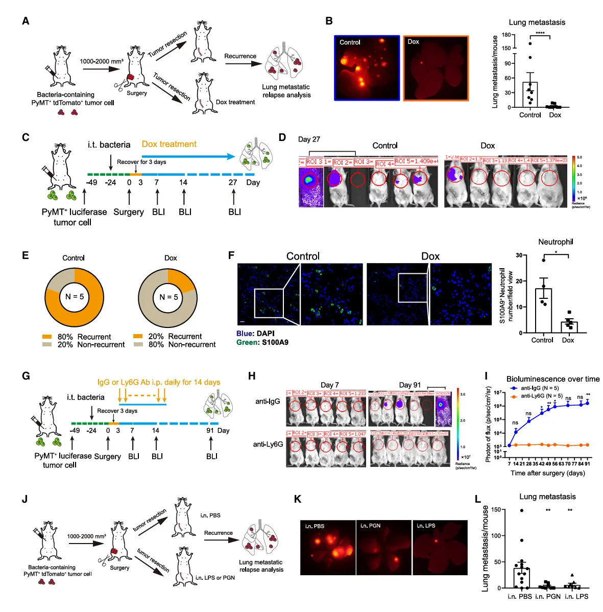 在自发肿瘤移植模型中,87%的小鼠术后出现肺转移复发。使用多西环素清除肿瘤内细菌后,肺转移复发率从80%显著降至20%,且肺中性粒细胞浸润减少。