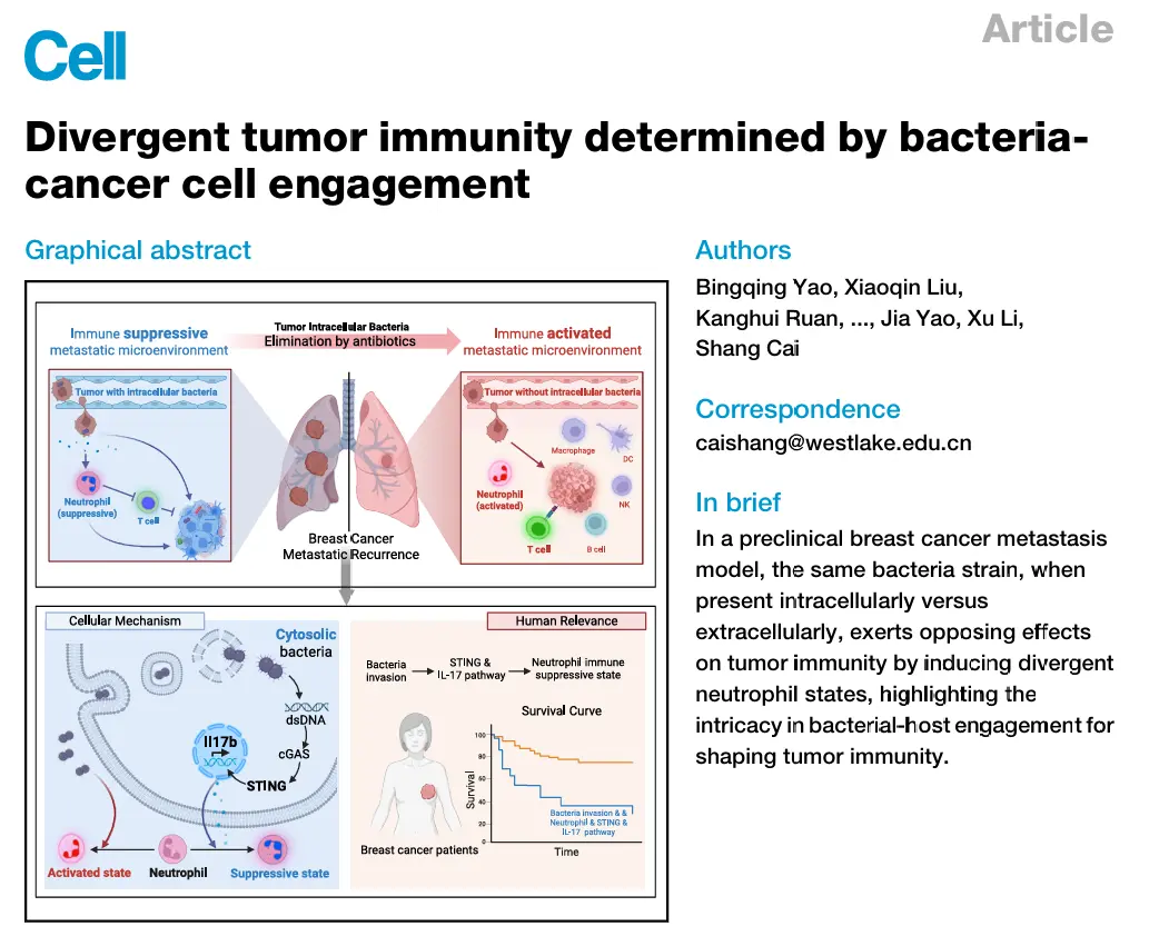 人类乳腺癌中存在保守的细菌-肿瘤细胞-中性粒细胞互作轴,其中细菌侵入通过激活cGAS-STING-IL-17B通路驱动中性粒细胞向免疫抑制表型转化,进而促进肿瘤进展,这为靶向肿瘤内细菌的干预策略提供了临床依据。