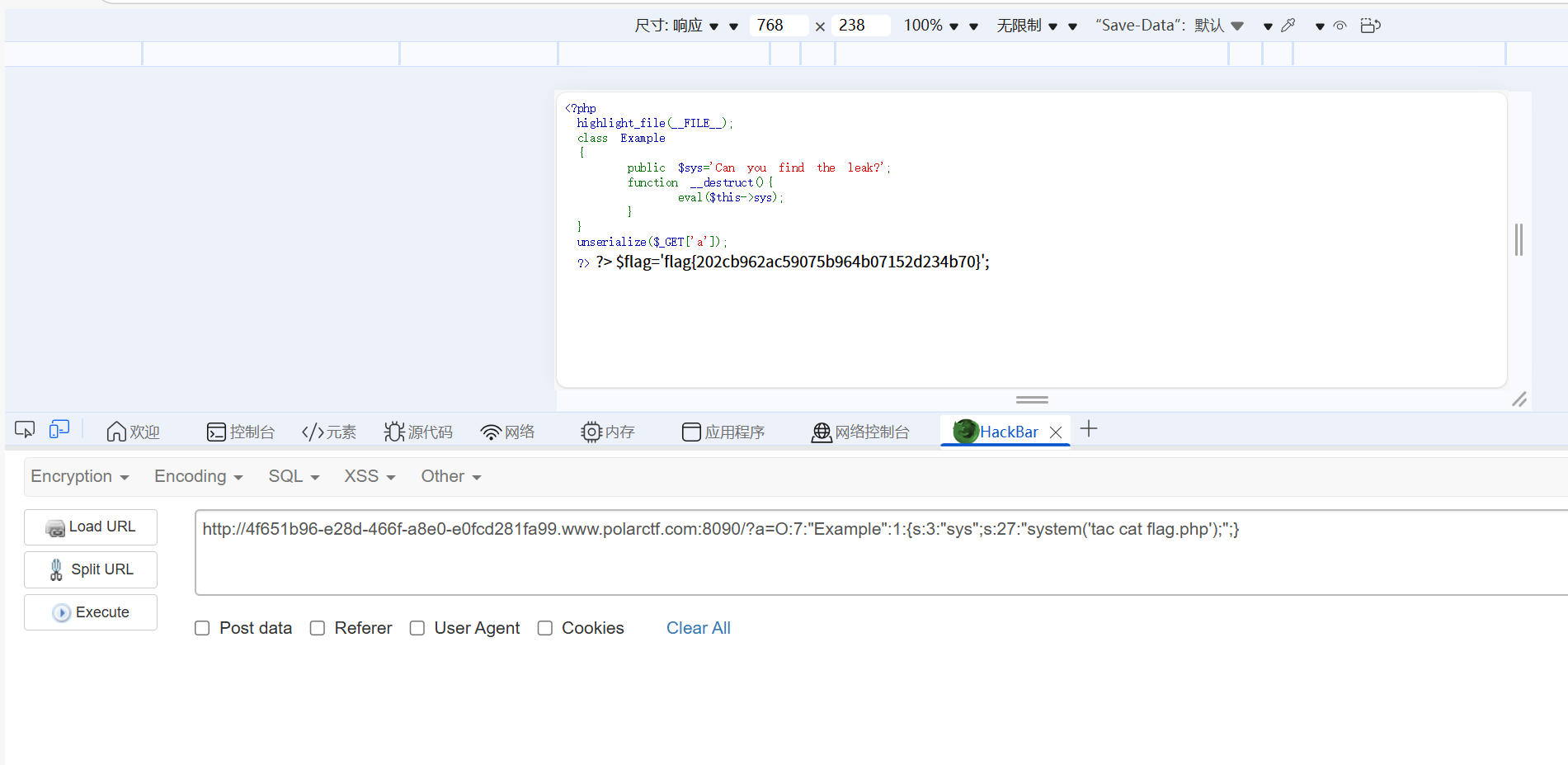 构造一个 Example 类的对象,把 $sys 属性改成我们想执行的 PHP 代码,再将对象序列化成字符串,通过 ?a= 传入
