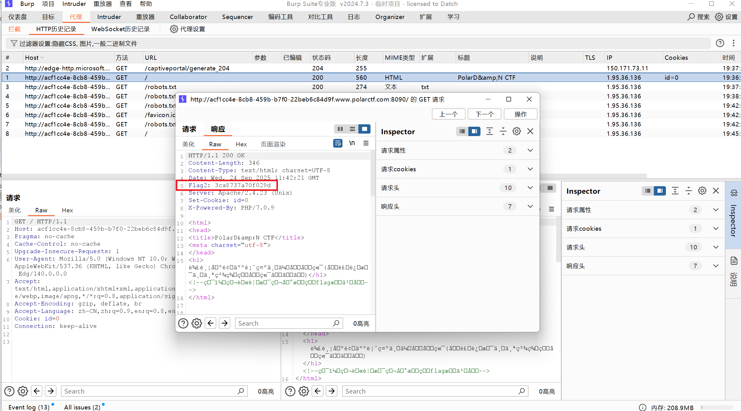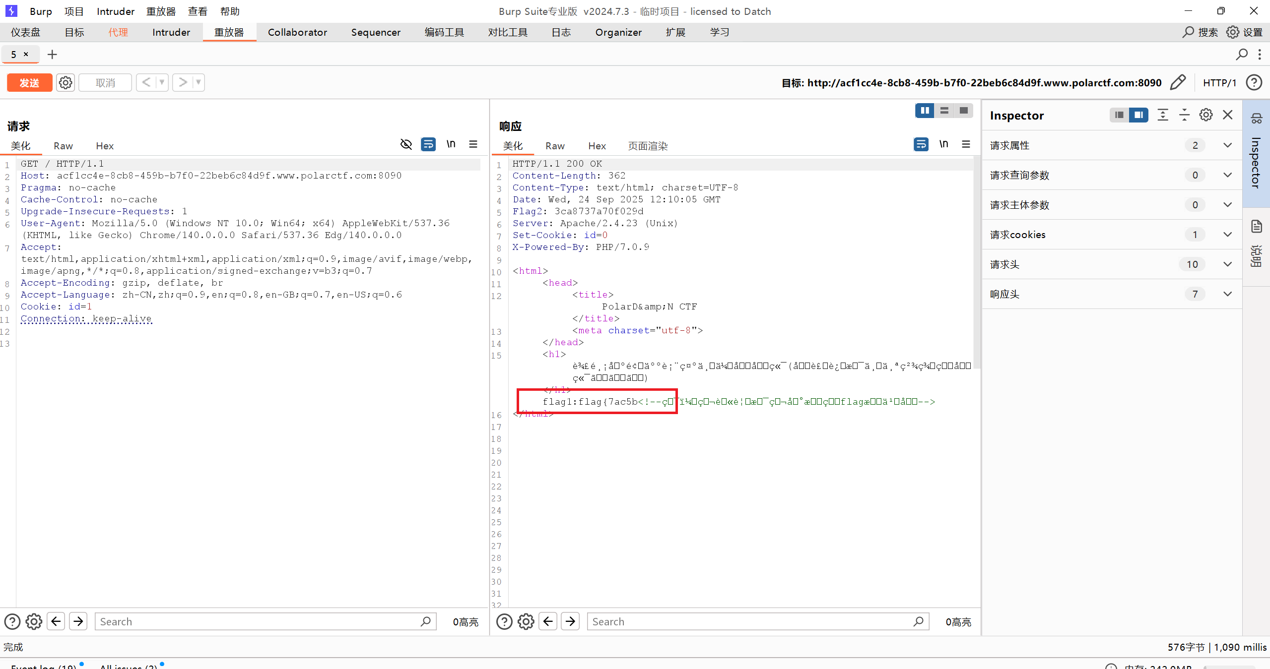 看源代码没啥思路,用bp抓包,找了半天终于在响应这二找到了flag2
