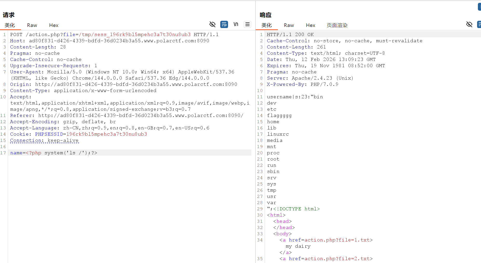 当通过 POST 传入 name 参数时,PHP会把Session数据写入服务器本地的 Session 文件;如果在 name 里传入恶意 PHP 代码(比如 <?php system('ls');?>),这段代码会被写入 Session 文件;再利用 include($_GET['file']) 的 LFI 漏洞,包含这个 Session 文件,PHP 就会执行里面的恶意代码。那么就用session恶意文件上传