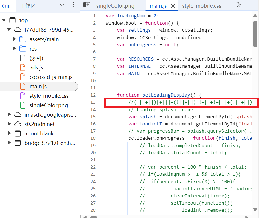 看源代码,发现在main.js有一段不知道什么加密的文本