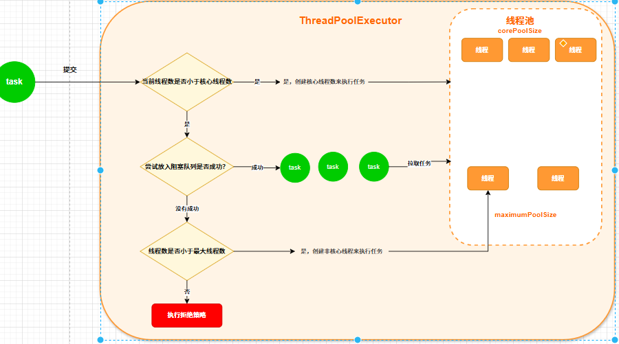 如果小于最大线程数,那么也会创建非核心线程来执行提交的任务,如图