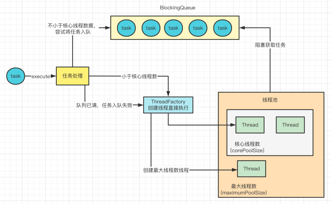 - workQueue.offer(command):尝试往阻塞队列中添加任务。添加失败就会再次调用 addWorker 尝试添加非核心线程来执行任务;如果还是失败了,就会调用 reject(command)来拒绝这个任务。