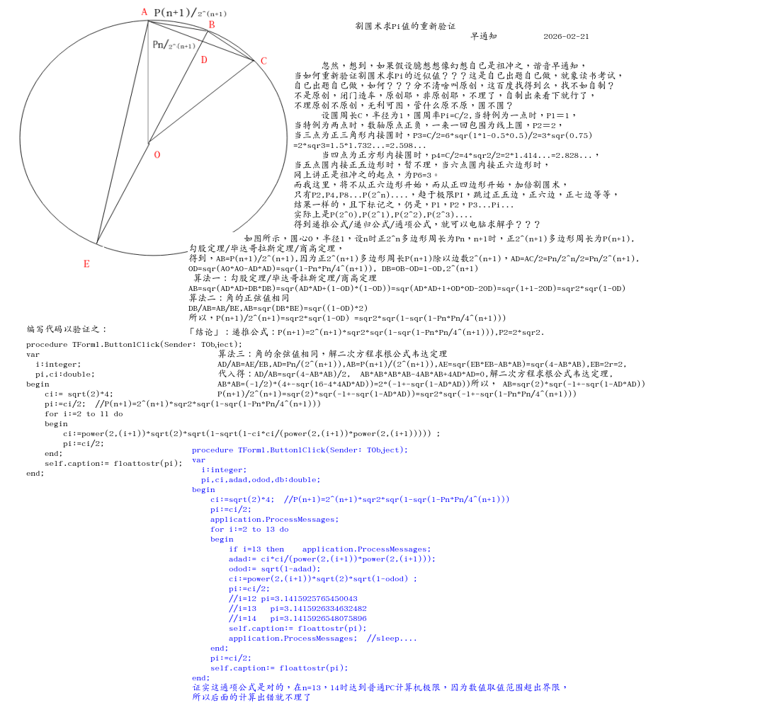 「结论」:递推公式:P(n+1)=2^(n+1)*sqr2*sqr(1-sqr(1-Pn*Pn/4^(n+1))),P2=2*sqr2.