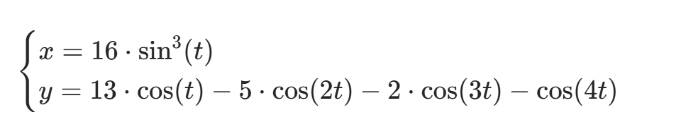 - 方程意义:通过三角函数的组合,让 (x,y) 坐标的轨迹自然形成对称的爱心轮廓;