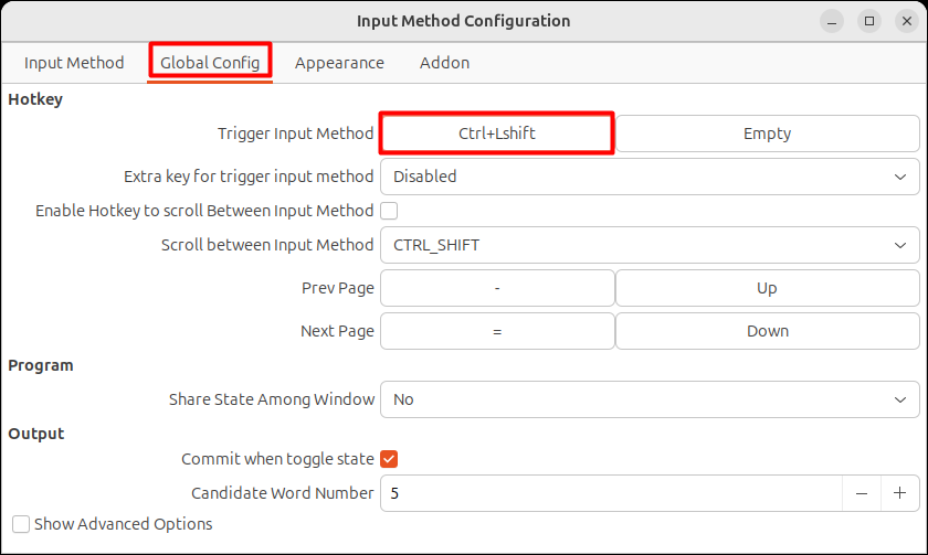 如果想自定义输入法快捷键,可以在"输入法配置"对话框,切换到"全局设置",然后配置"触发输入法":