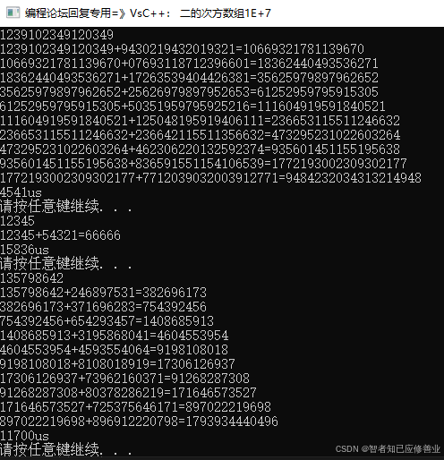 else if (j < strlen(a))j = 0, std::cout << a << "+" << b << "=";