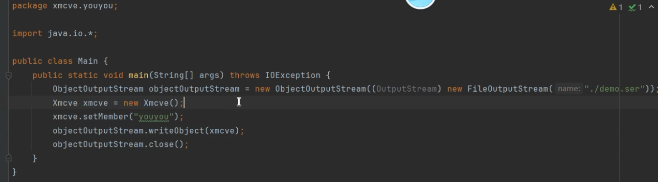 代码通过输出流对象创建了一共文件demo.ser 后续用writeobject将刚刚序列化的对象存入文件