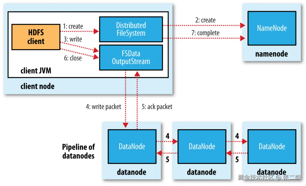 - HDFS在写入时会采用Pipeline的模式,即Client写入第一个副本,第一个副本在接收数据的同时写入第二个副本,以此往后传递。这样的目的是最大化利用集群带宽资源。