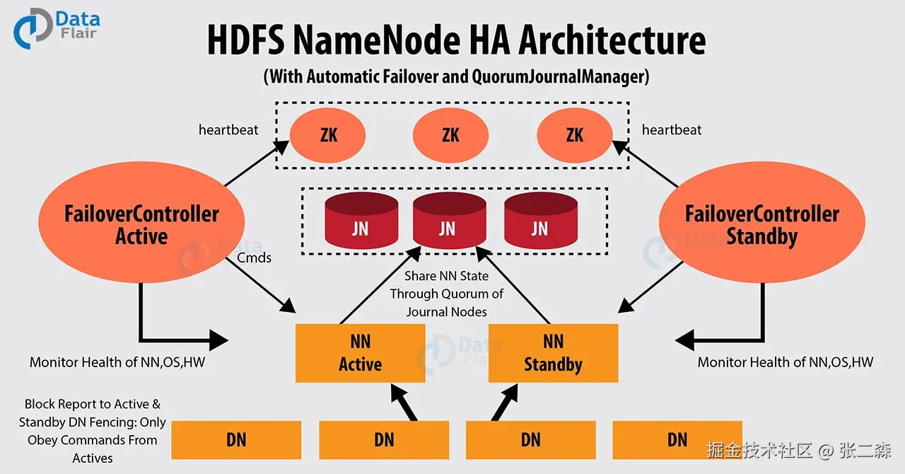 HDFS 采用了一组 JournalNodes(下图深红色块,后续简称为 JNs;Journal 在英语中有"日记"的意思)来记录 NameNode 的 WAL 日志(Write Ahead Log),这个 WAL 日志在 HDFS 被称作 EditLog。