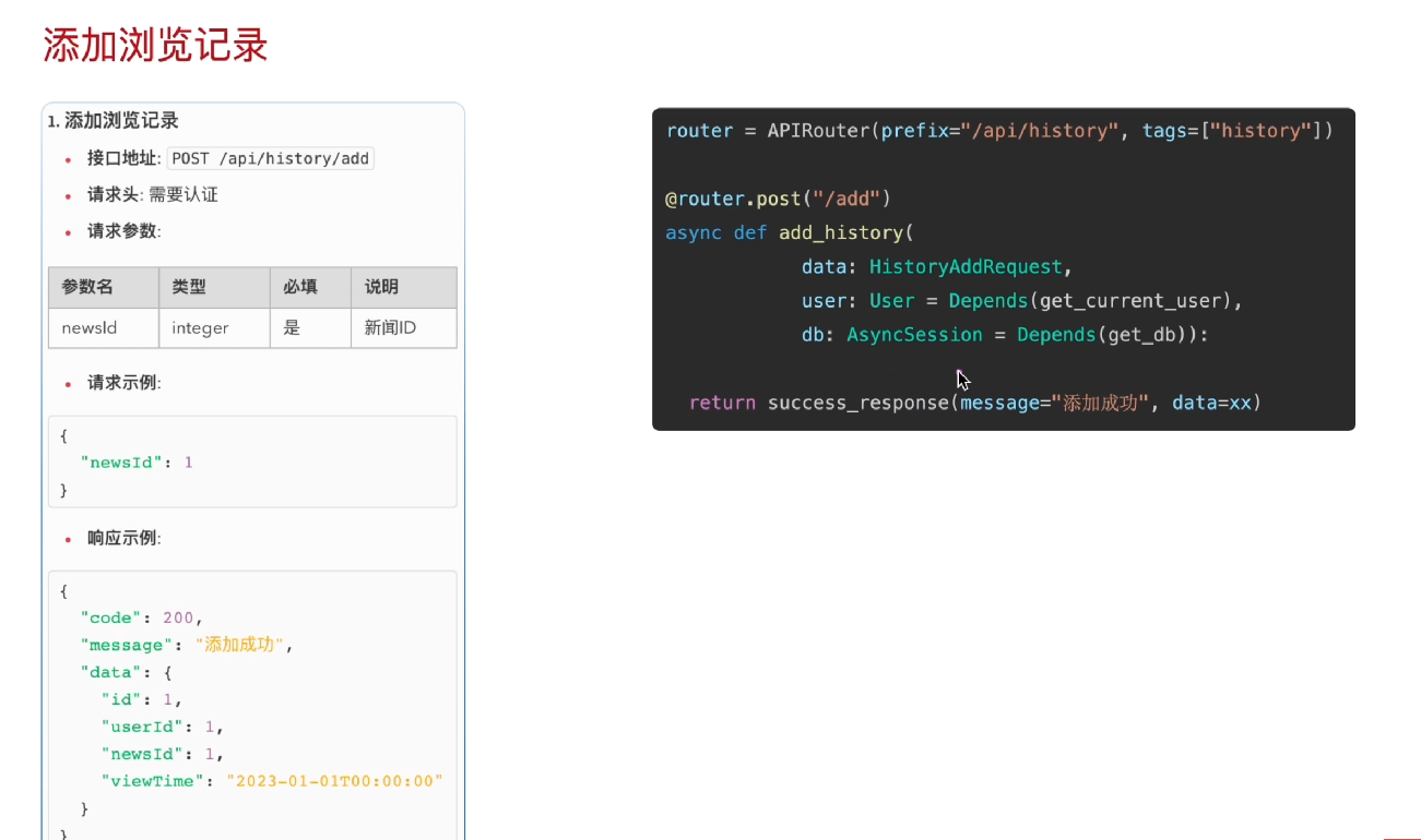 一个基于 FastAPI 框架实现的 "添加浏览记录" 接口的完整设计与实现,主要分为接口文档说明 和代码实现两部分: