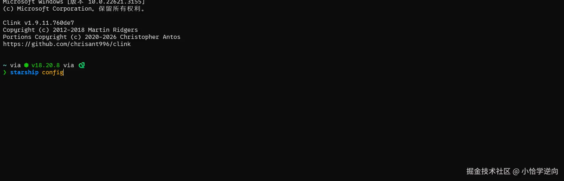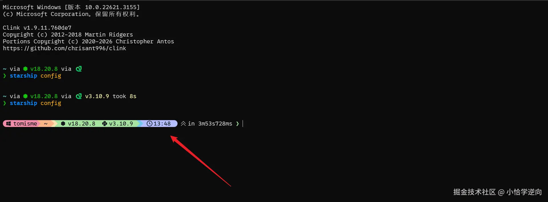 回到cmd终端,输入命令:starship config