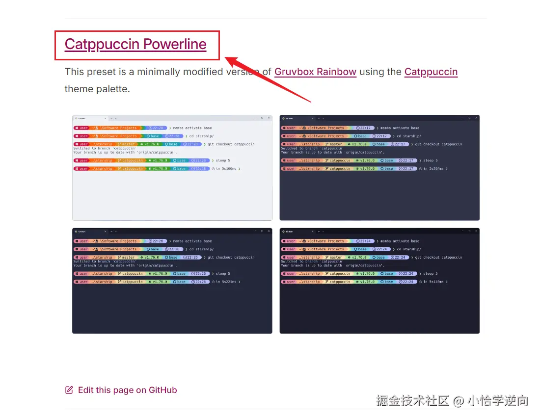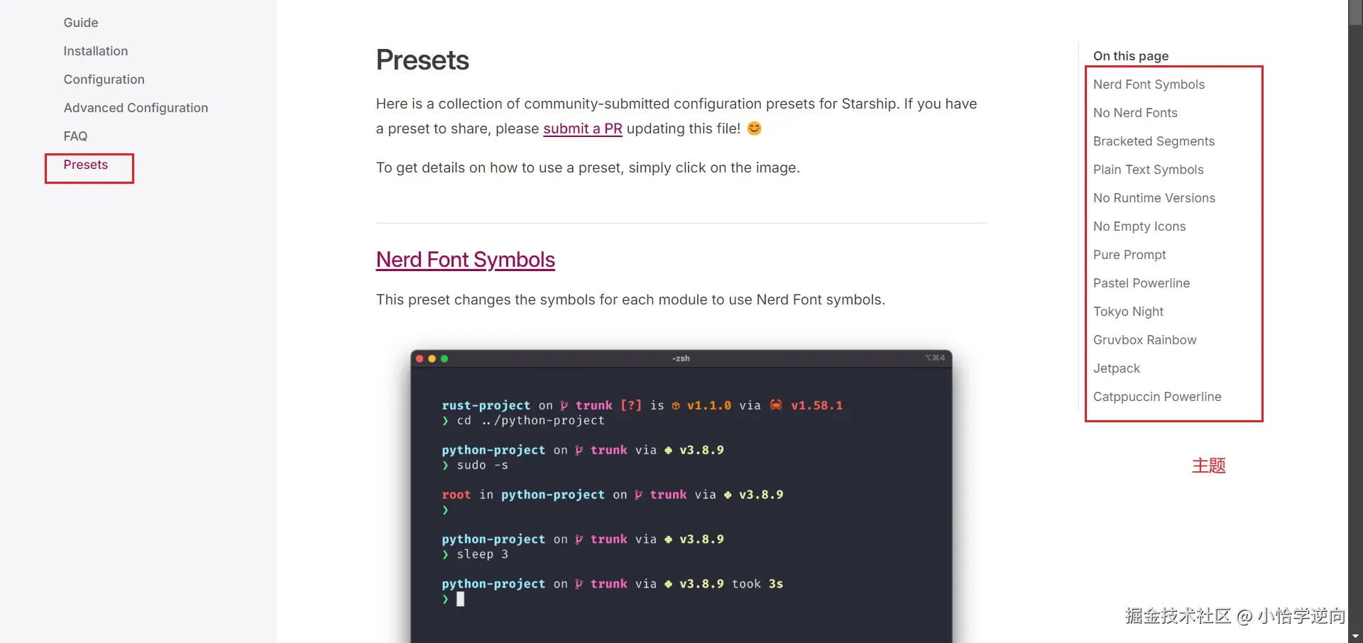 如果你对starship的初始主题不喜欢的话,也可以进行主题更换,首先在starship官网找到Presets选项,在这选项中会有很多主题供你选择