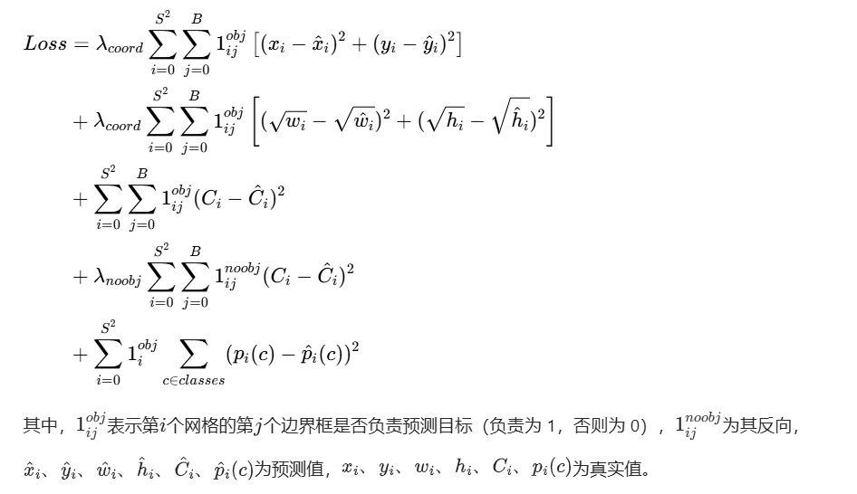 YOLOv1 完整损失函数公式如下,更直观体现各部分权重设计: