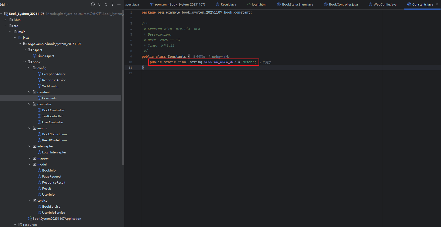 新建一个常量类(Constant),登录接口处,存储的Session中的 Key,设置为 常量(常量名称,统统大写)