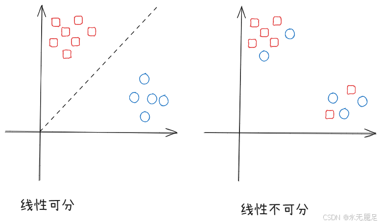 假设在二维空间中,使用一条直线可以将样本完美分类,即为线性可分,否则为线性不可分。