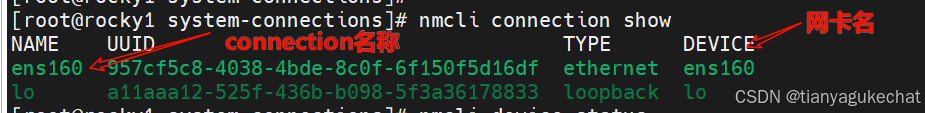 例如:我的网卡为ens160,connection 名称为 ens160 , IP配置为192.168.100.100/24