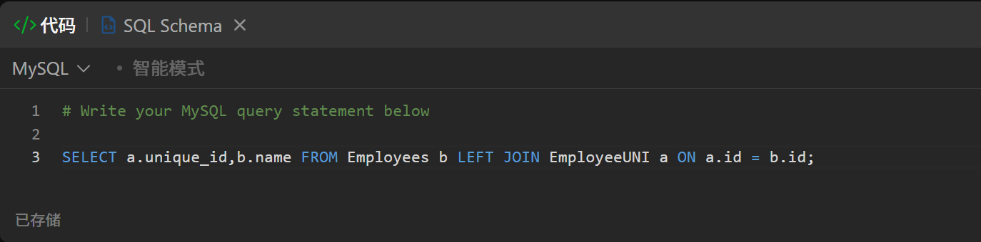 **思路:**这道SQL需要我们查出所有Employees表中的员工的唯一标识码,而却不一定在EmployeeUNI表中存在,若不存在就使用