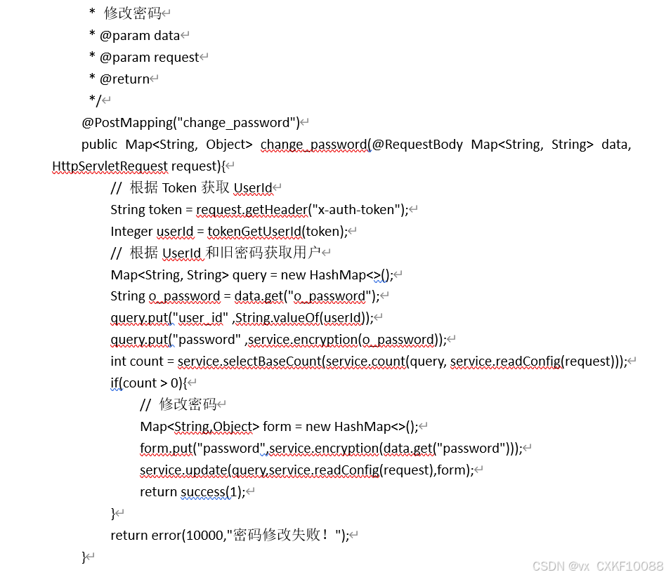 修改密码,通过请求data,获取旧密码,并将新密码重新赋值,期间都是需要通过加密,代码如图所示。