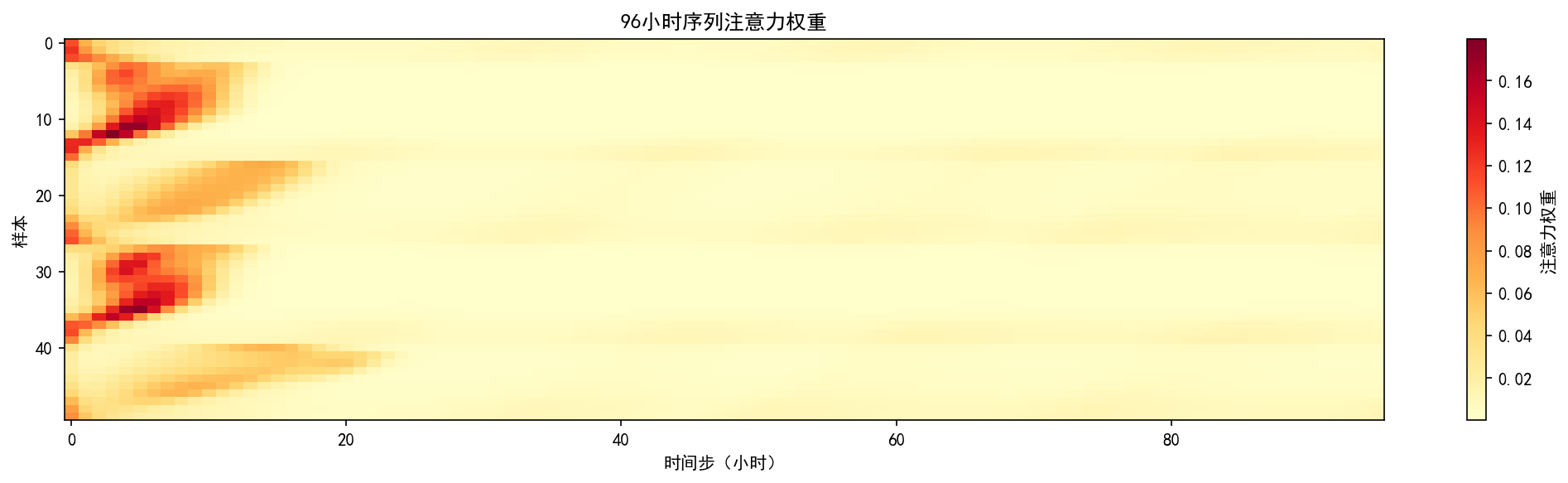 实验结果表明,GRU取得了最优性能(RMSE=0.1962,R²=0.9351),LSTM次之(R²=0.9107),两者均显著优于XGBoost(R²=0.8991)和线性基线(R²=0.5382),验证了循环神经网络在时序建模上的优势。消融实验显示,移除滞后特征后R²从0.9188降至0.8768,移除周期编码后降至0.9010,证实两组特征提供了互补的预测信息。排列特征重要性分析发现hour_cos和hour_sin的RMSE增量远超其他特征,表明小时周期是需求波动的核心驱动因素;注意力权重热力图显示模型将注意力集中在最近约20个时间步,符合短期需求预测依赖近期历史的直觉。