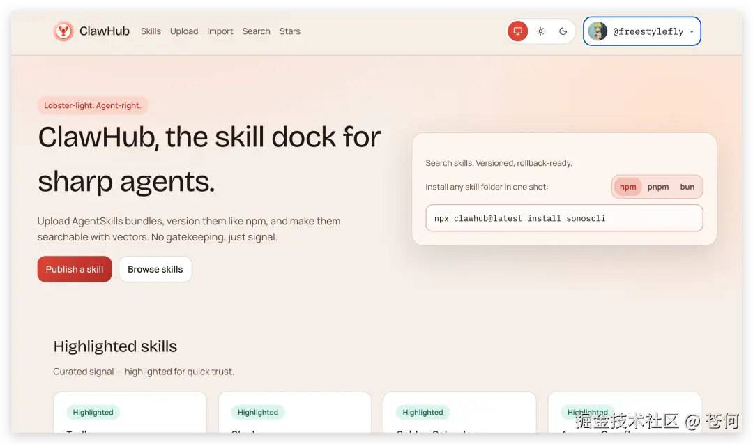 ClawHub 是专门为小龙虾提供的 skill 仓库,这里有非常多好用的 skill。