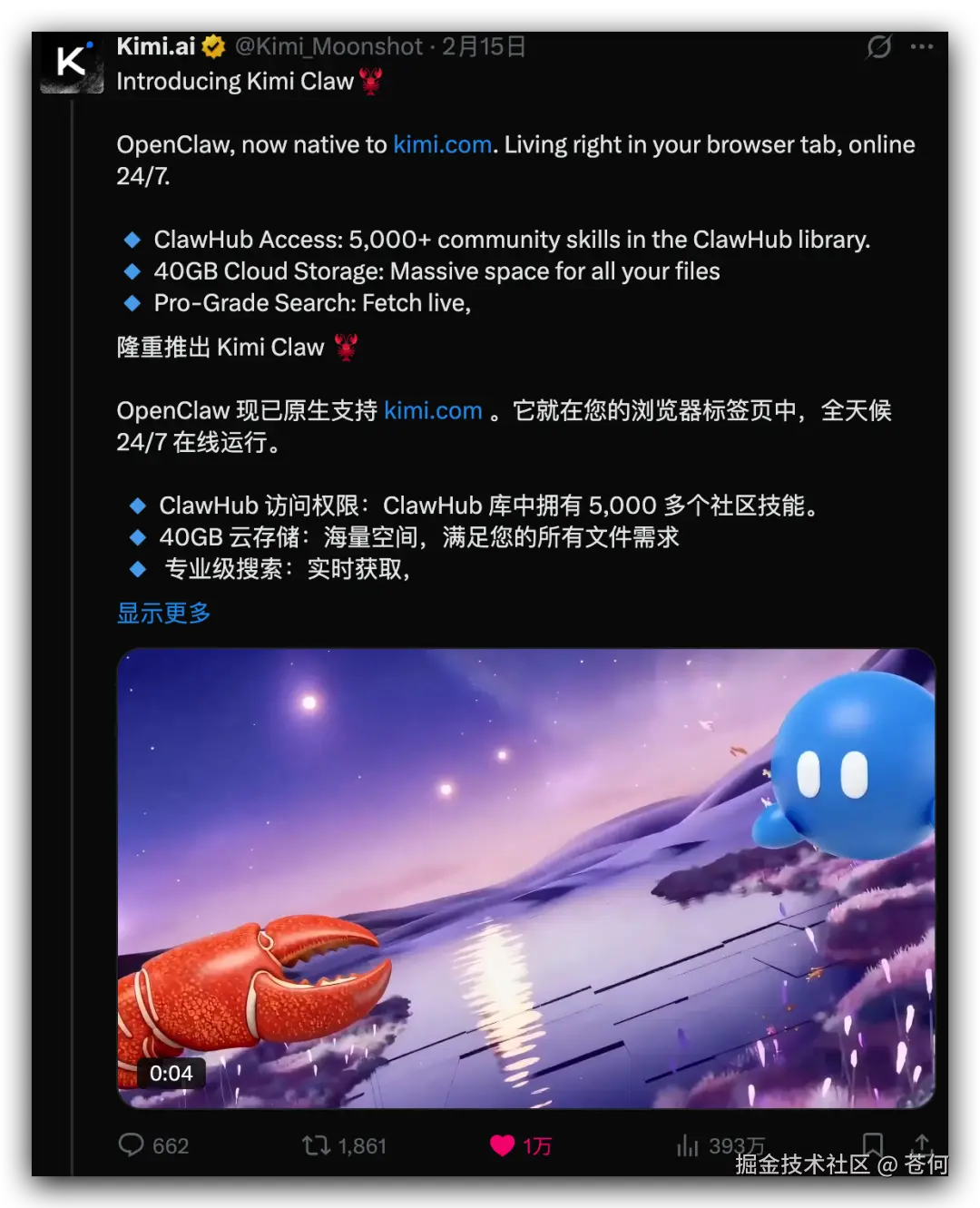 在 X 上刷到 Kimi 上线了 OpenClaw,🔥的不行。