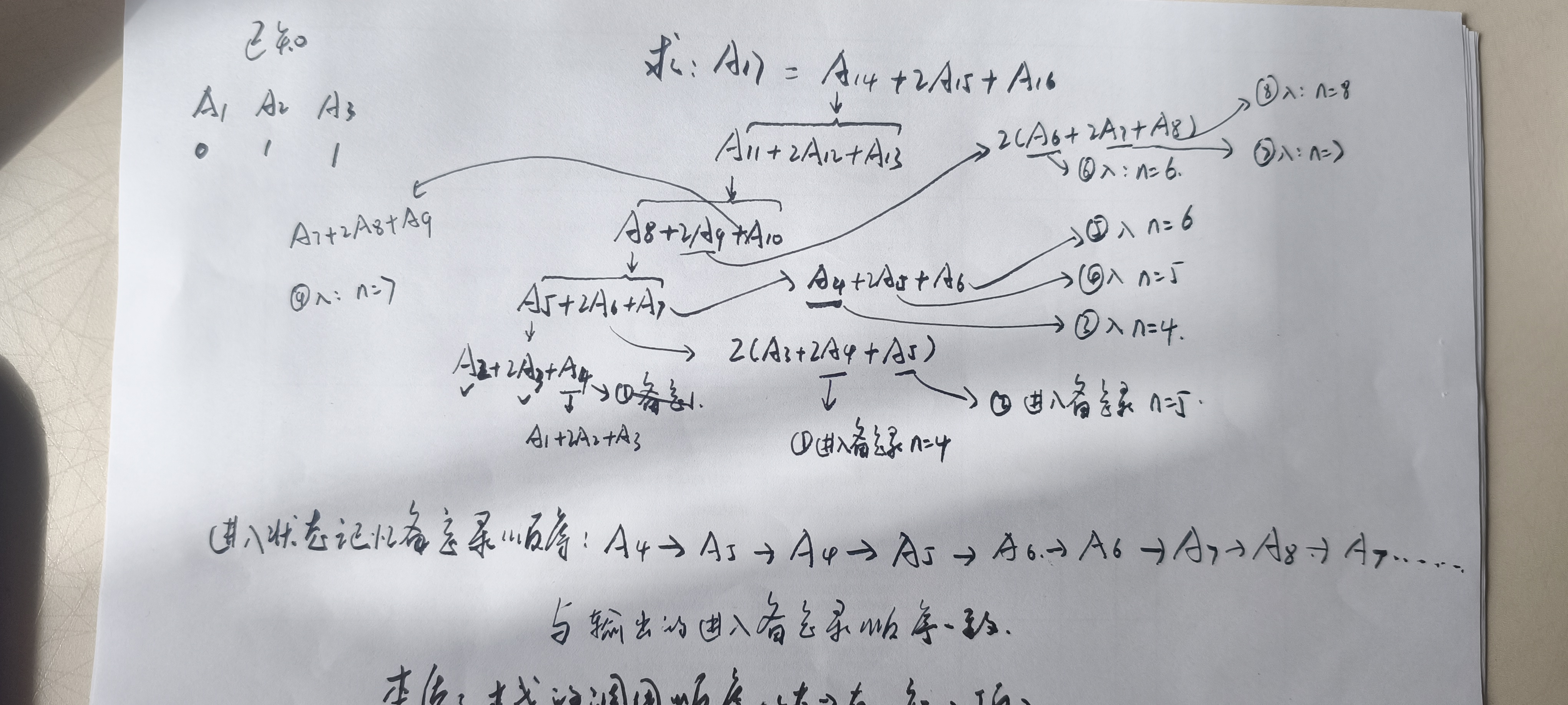 这个数列:f(n)=f(n−1)+2f(n−2)+f(n−3),这个代表:的三阶线性递推模型。