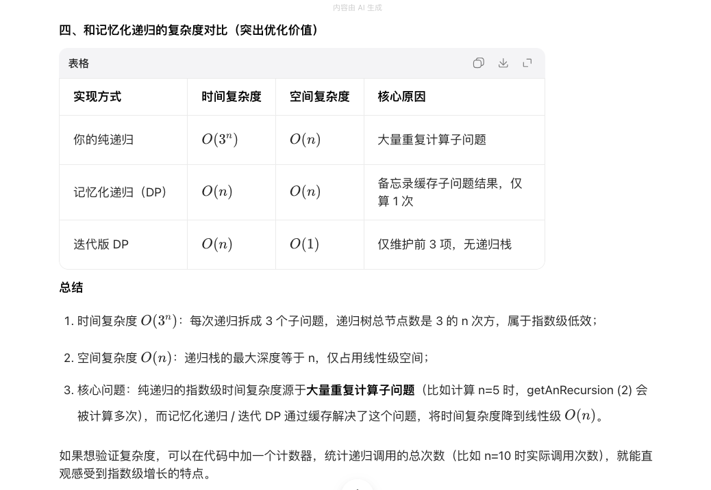 * A13在计算A15的时候其实已经计算过了,但是在计算A17的时候还是会"递归到底(0 1 1)",当n很大这样浪费大量资源,且时间复杂度为 O(3^n),空间复杂度为:O(n)