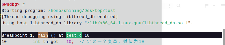 这句话的意思是:成功在 test.c 的第 10 行(int target = 10;)设置了一个断点,断点编号是 1(后续管理断点会用到这个编号)。这里的 0x401146 是该代码对应的机器码地址(新手暂时不用关注)。