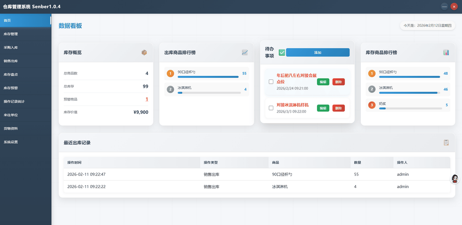 ++1. 启动应用程序仓库管理系统Senbar.exe。++