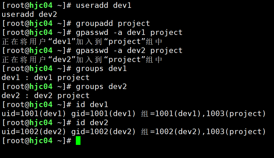 要把 dev1 和 dev2 加入 project 组,可以使用以下常用命令: