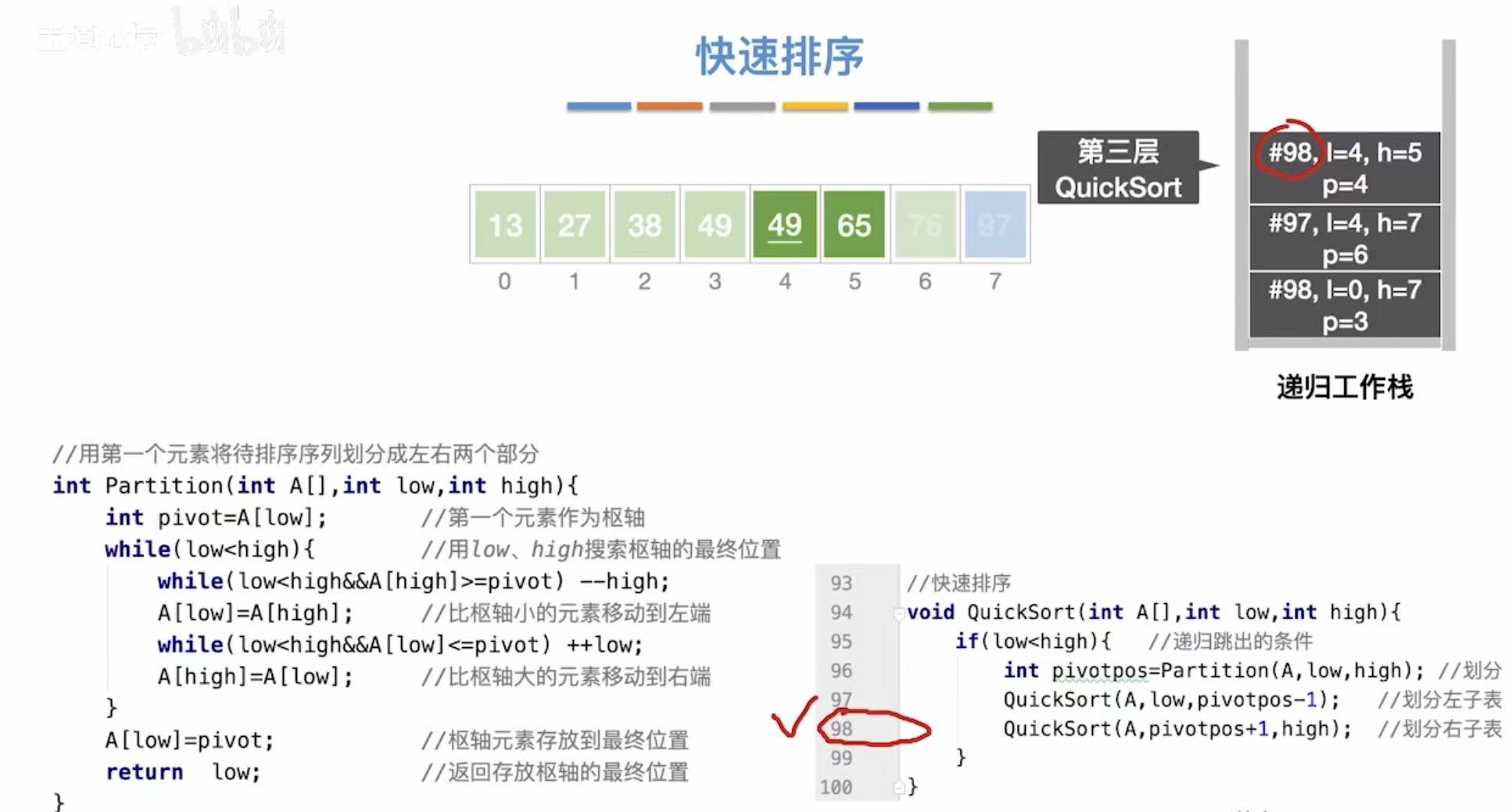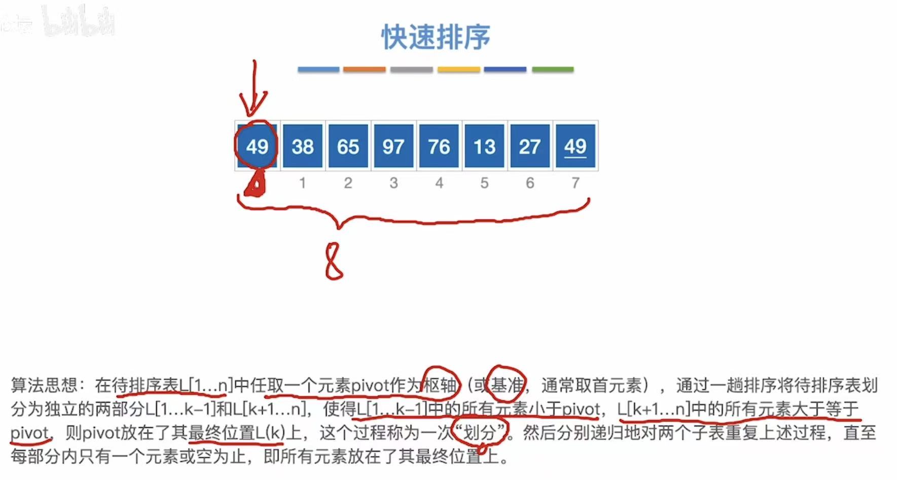 0 | 7 | 处理整个数组,pivot = A[0] = 49 |