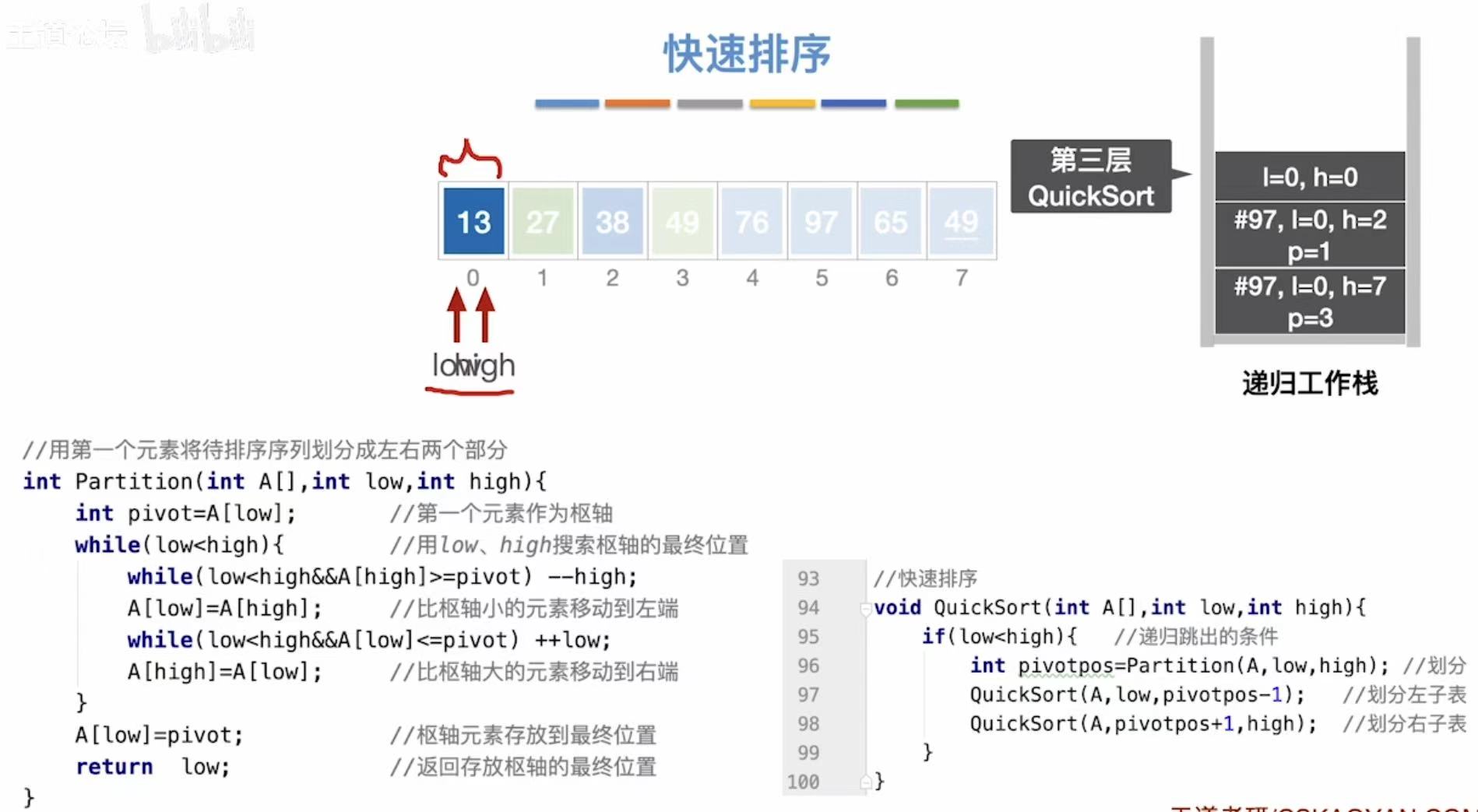 - high指向13,13<49,13插入到low的位置