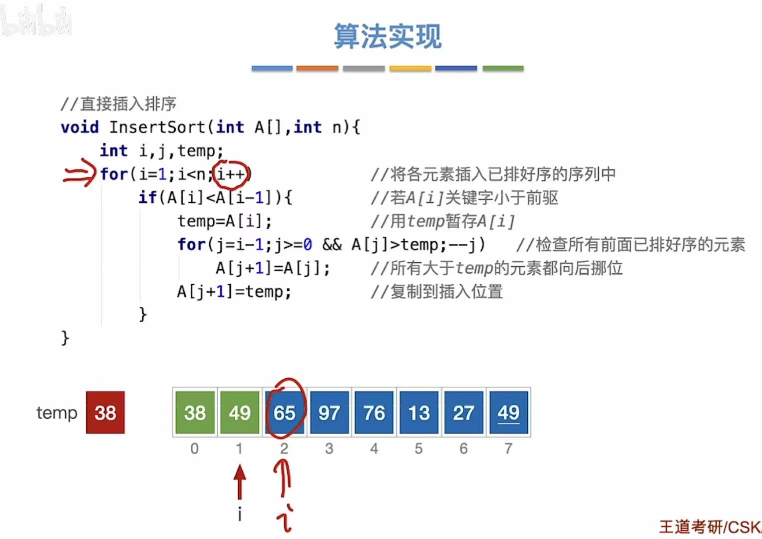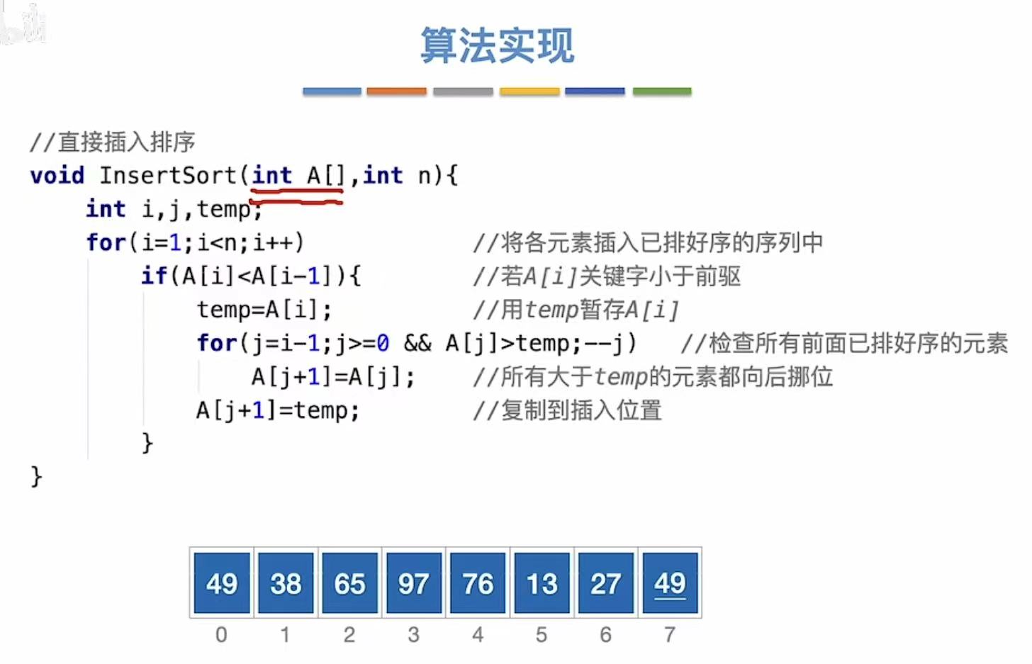 int i, j, temp; // i: 当前待插入元素的下标;j: 用于向前比较的指针;temp: 暂存当前元素
