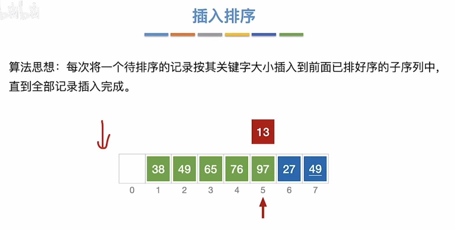 - 27和前面的所有数字比,27出来,前面除了13所有数字向后移动一位,然后27插入到位置1