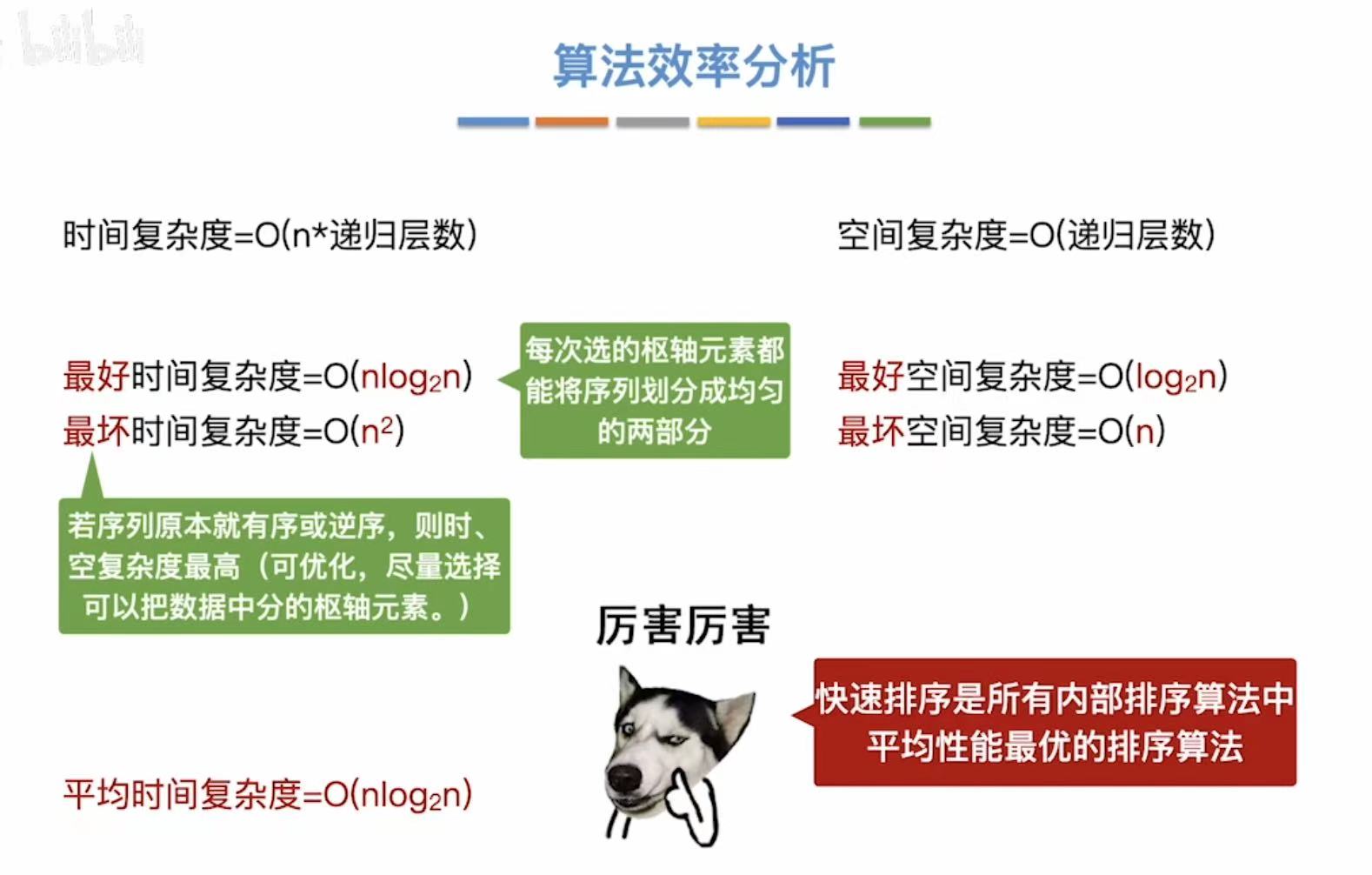时间复杂度、空间复杂度和稳定性。
