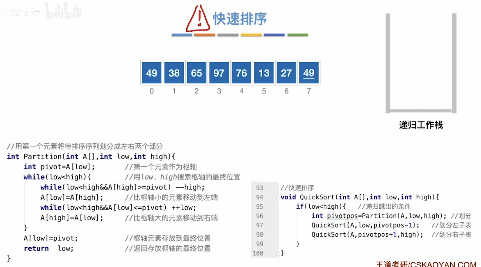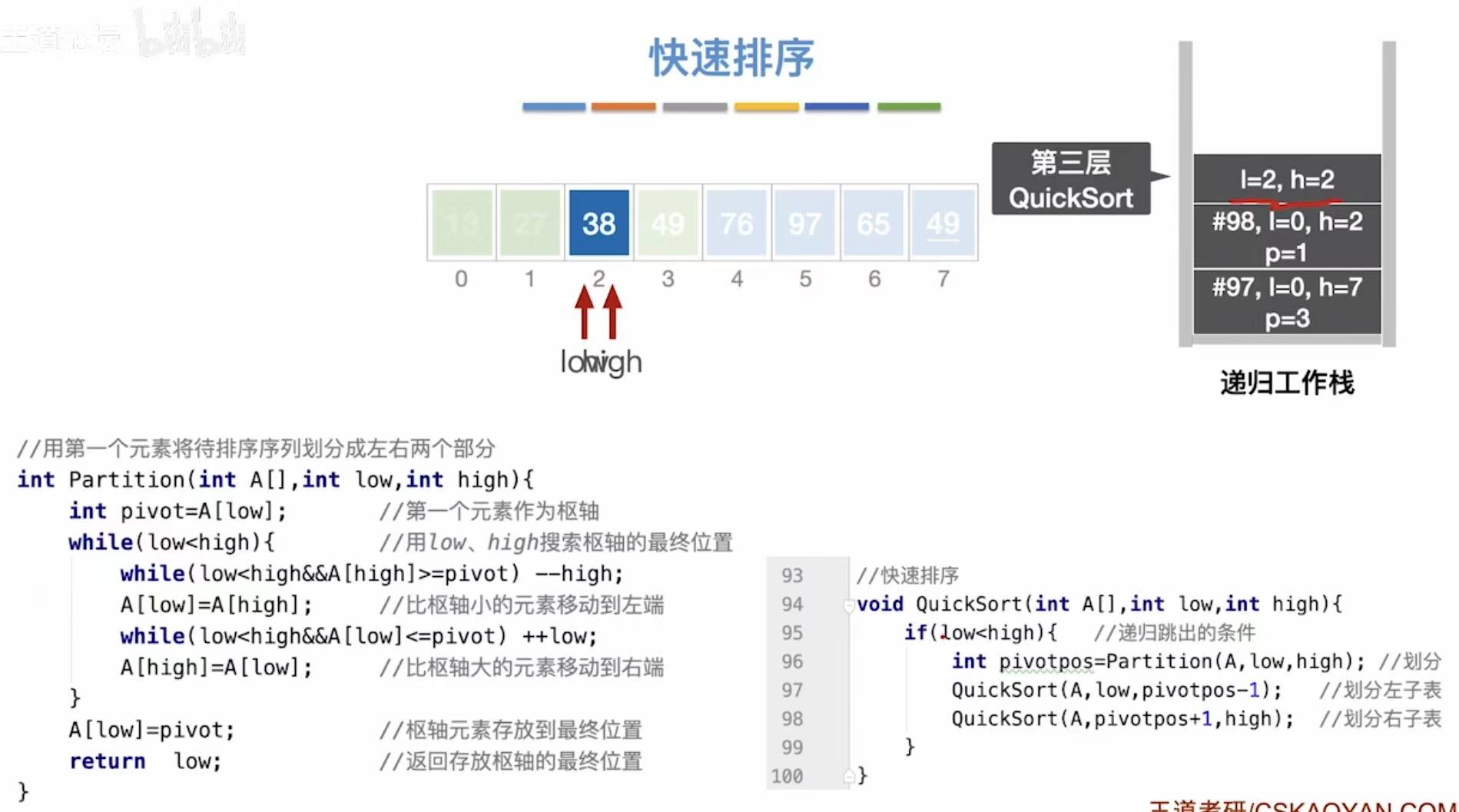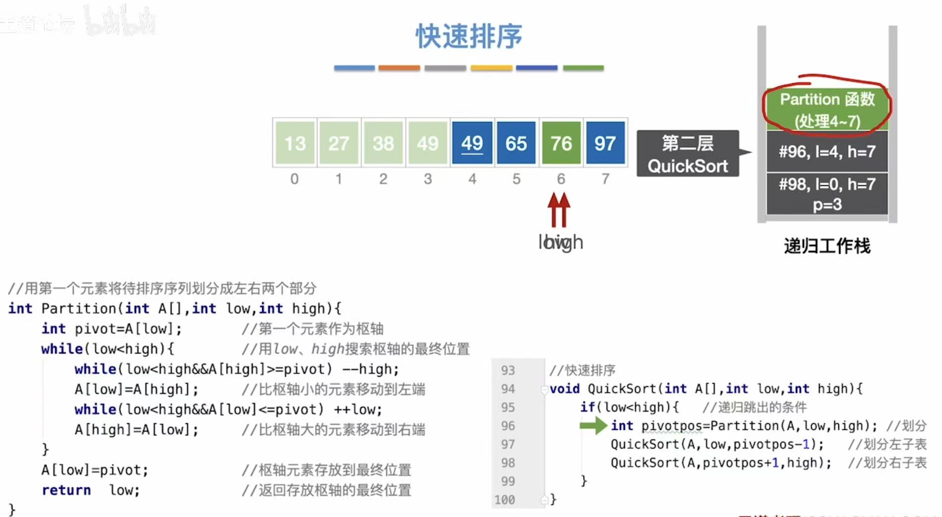 int pivotpos = Partition(A, low, high); // 划分数组,返回枢轴位置